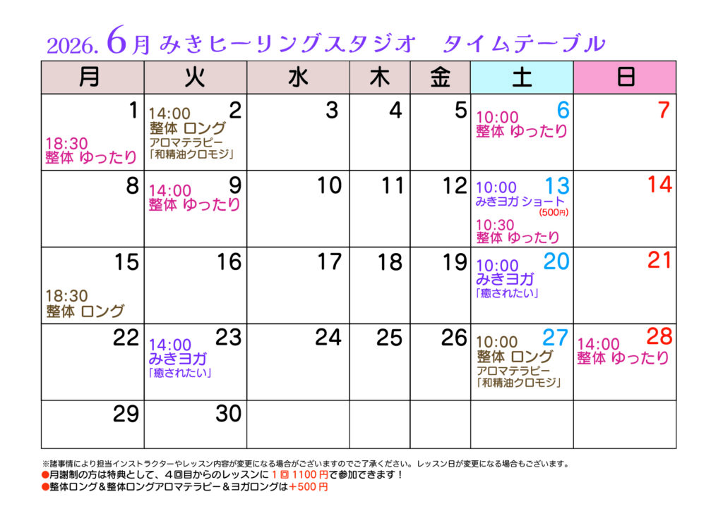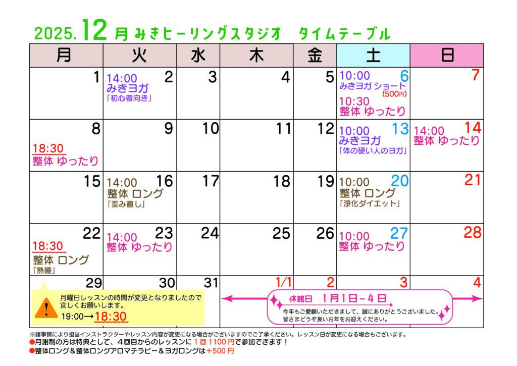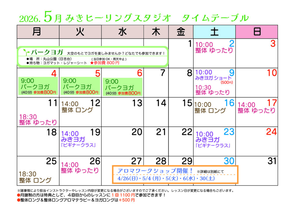 スタジオレッスン(ヨガ、みきYOGA、予防整体)のタイムテーブルです。