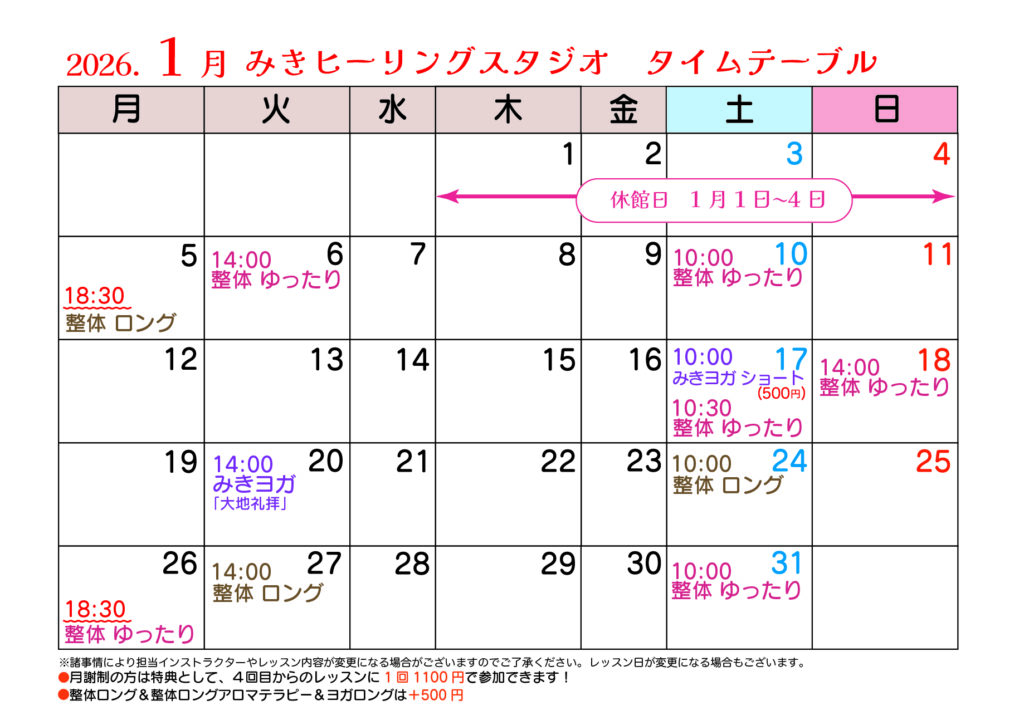 【2026年 1月】4日(日)、11日(日)、18日(日)、25日(日)